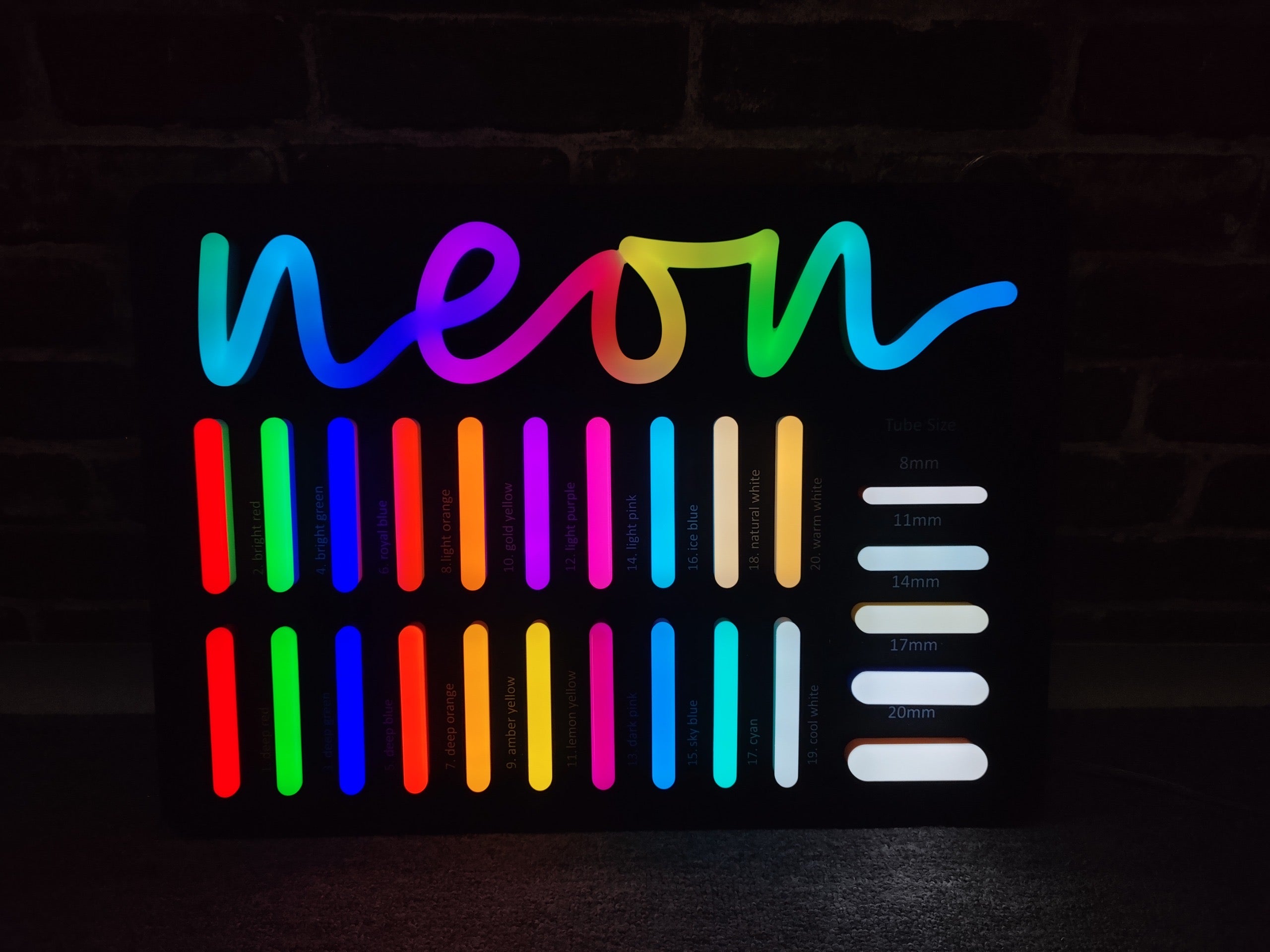 Sobre placa de acrílico (estándar): El neón está montado sobre una lámina sólida de acrílico. Elija entre un fondo transparente, pintado o con impresión UV personalizada para un estilo único.