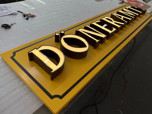 - Letreros totalmente personalizables : Elija entre letreros de neón, acrílico, letras de canal, con iluminación frontal, retroiluminada o tipo caja de luz con impresión UV para obtener logotipos y gráficos vibrantes.